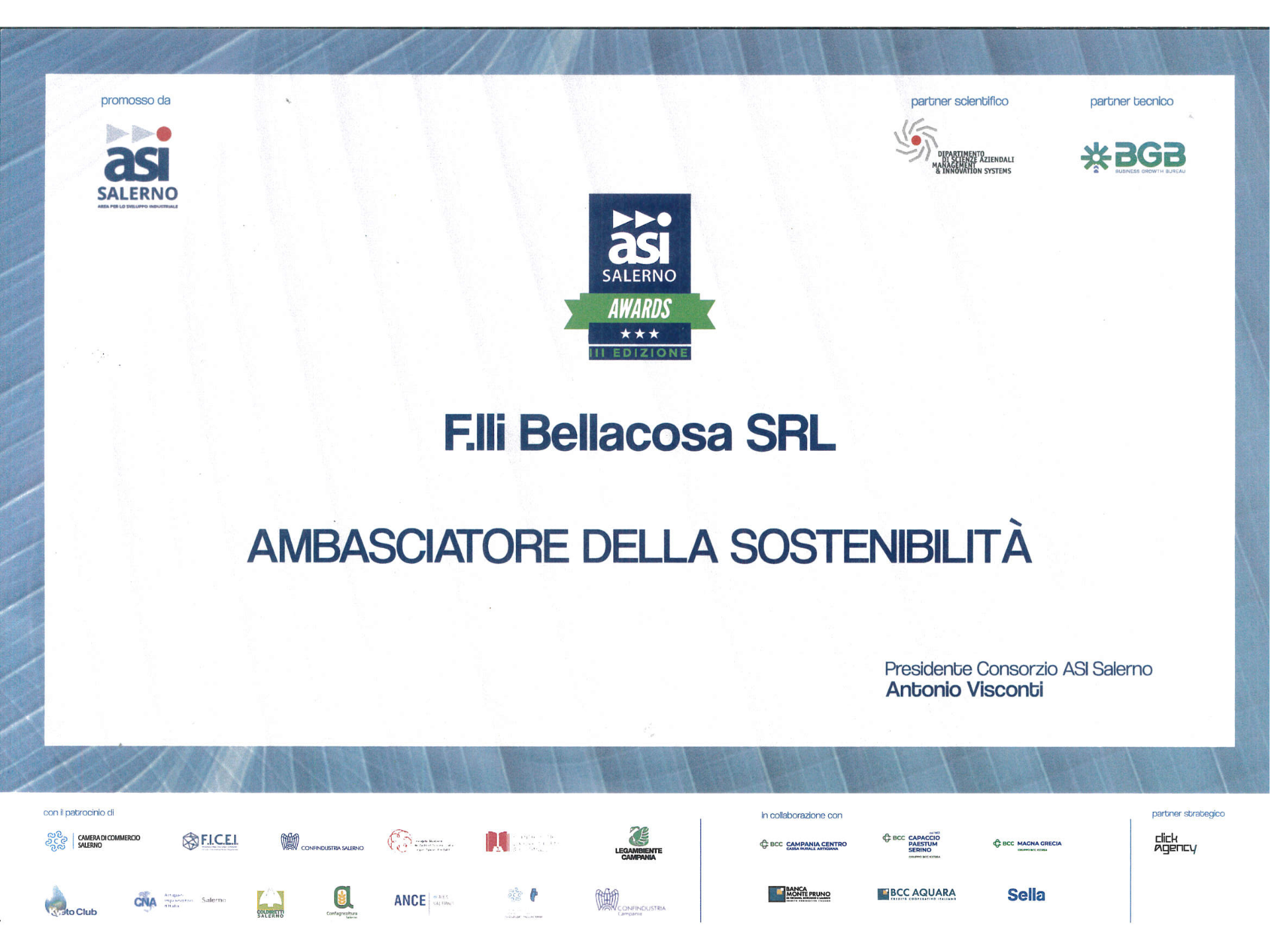 Fratelli Bellacosa Srl è stata insignita del prestigioso riconoscimento “Ambasciatore della Sostenibilità” nell’ambito degli ASI Salerno Awards – III Edizione. Questo premio valorizza l’impegno costante dell’azienda nel promuovere pratiche sostenibili, innovazione responsabile e attenzione al territorio, confermando il ruolo attivo di Fratelli Bellacosa nello sviluppo industriale sostenibile.